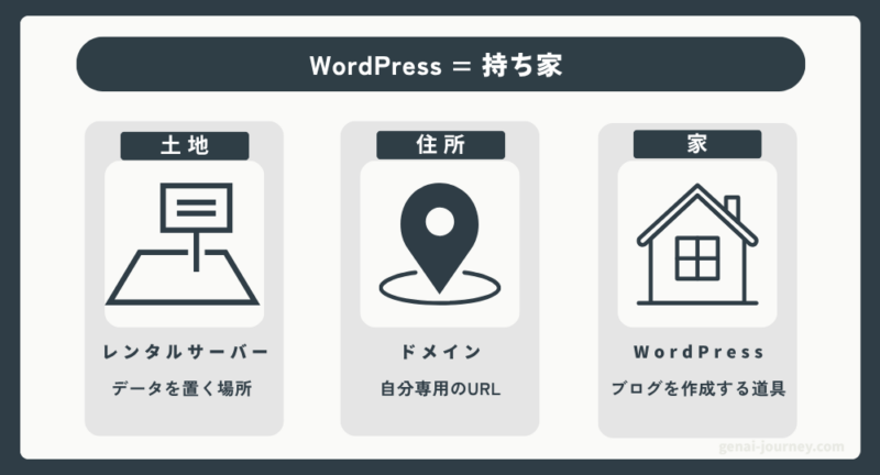 WordPressは、自分で土地(サーバー)を借りて、住所(独自ドメイン)を取得して、家(ブログ)を建てるイメージです。