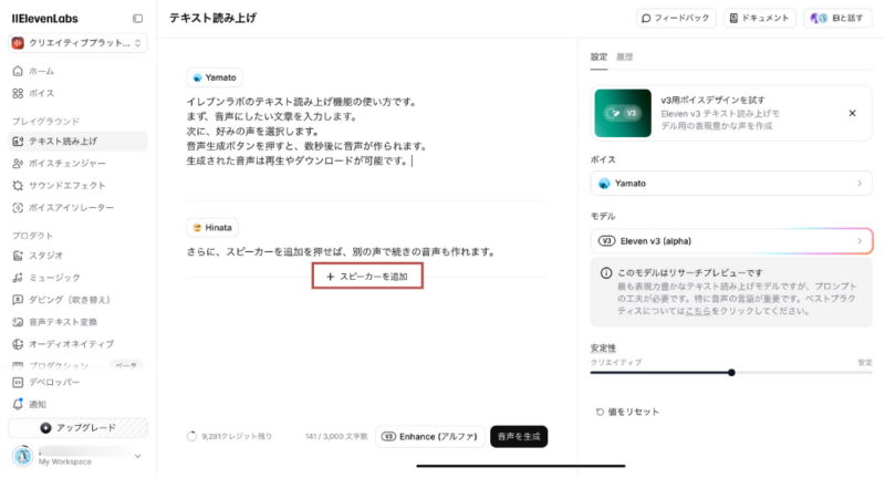 さらに、「スピーカーを追加」を押せば、別の声で続けて音声を生成することもできます。