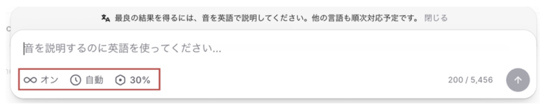 • 数値指定(例:30%):数値が高いほどプロンプトに忠実な音になります。