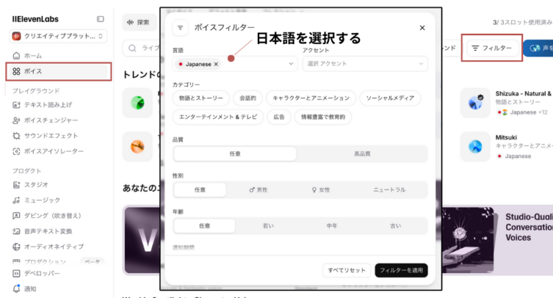 テキストから自然な日本語音声を生成するには、最初にお気に入りのボイスを探しましょう。