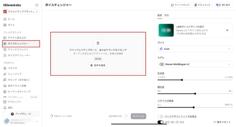 音声作成にはクレジットが必要で、それを消費していきます。