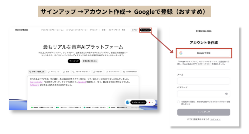 ElevenLabsにアクセスし、右上の「無料で始める」または「Sign Up」をクリックします。